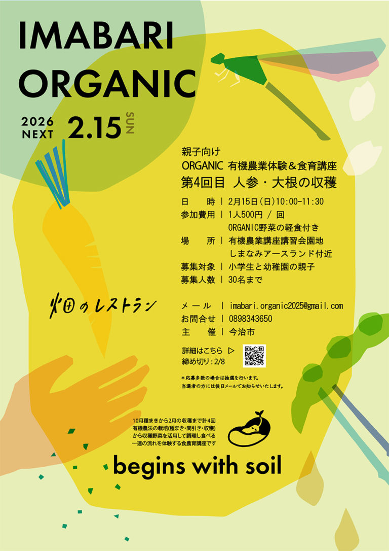 2024年3月、今治市はオーガニックビレッジ宣言をおこないました。ここ「今治」の地に受け継がれてきた豊かな土壌をもとに、未来に向けて有機農業の輪を広げ、有機生活が日常に根付いていくことを目的としたIMABARI ORGANIC “畑のレストラン”という有機農業を推進する新たなプロジェクトが始まりました。